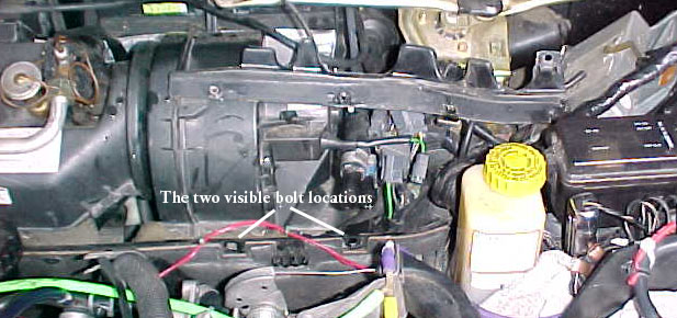 All are installed from the front side, at the bottom of the bulkhead. The sheetmetal piece in the picture is directly above where it installs. The two left-most bolt locations are visible. The two right-most are not (one is under the wiring harness and the other is below the ABS relay box.